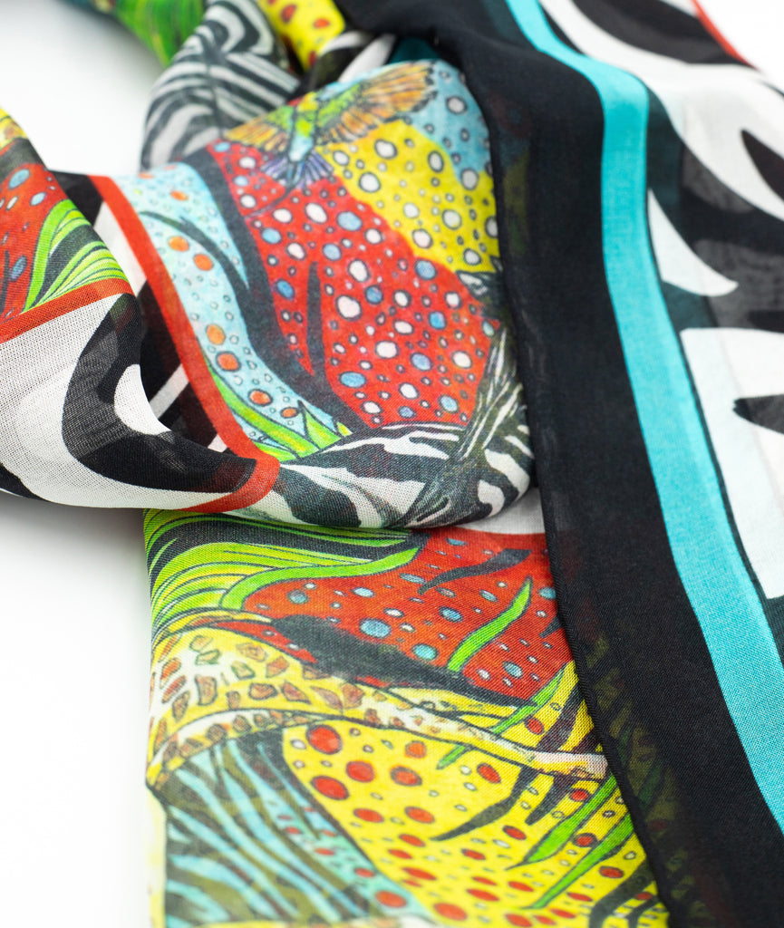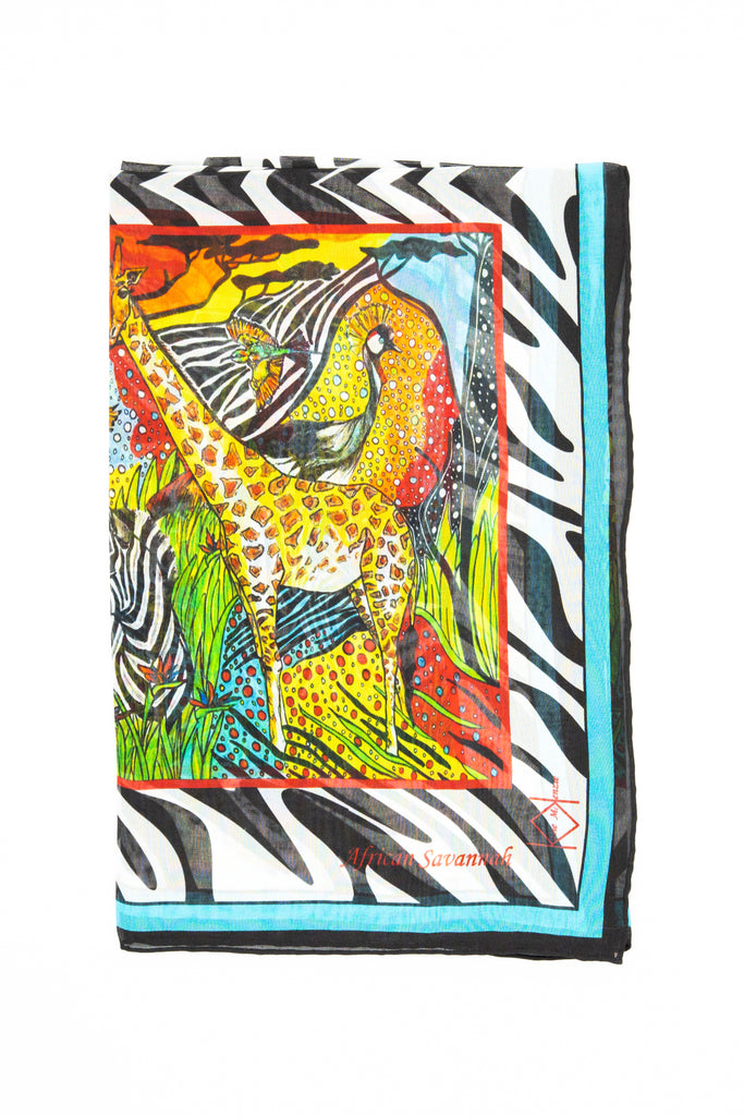 A luxurious and collectable fashion accessory that will always be in style. This design originates from an original drawing of Katie McKenzie titled 'AFRICAN SAVANNAH.' 100% Silk and Water-Based Inks. Dry Clean or Hand Wash Cold
