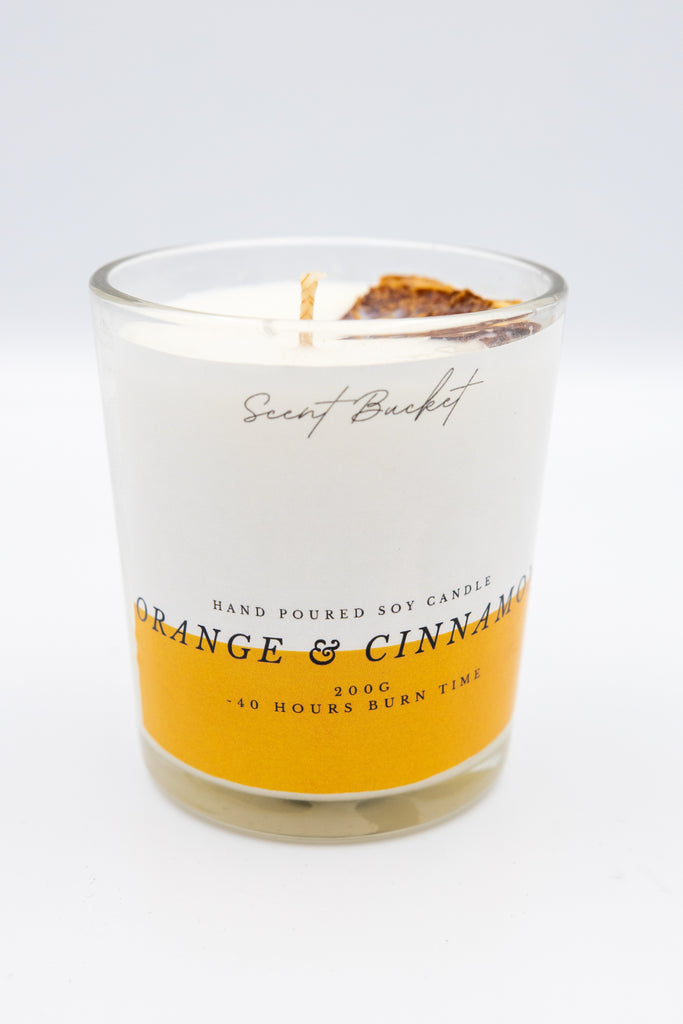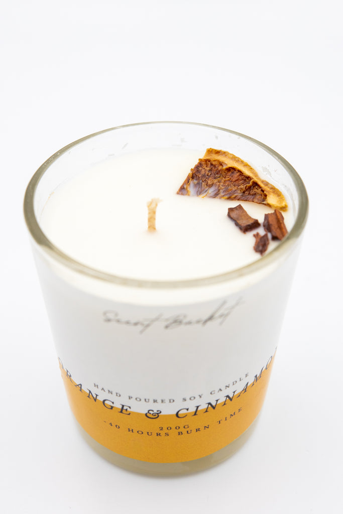 The orange and cinnamon scents just work together. This is a spicy, warm and earthy scent that will freshen up your room. Topped with a dehydrated orange and cinnamon for an aesthetically pleasing look. The candles are hand poured and made with 100% soy wax